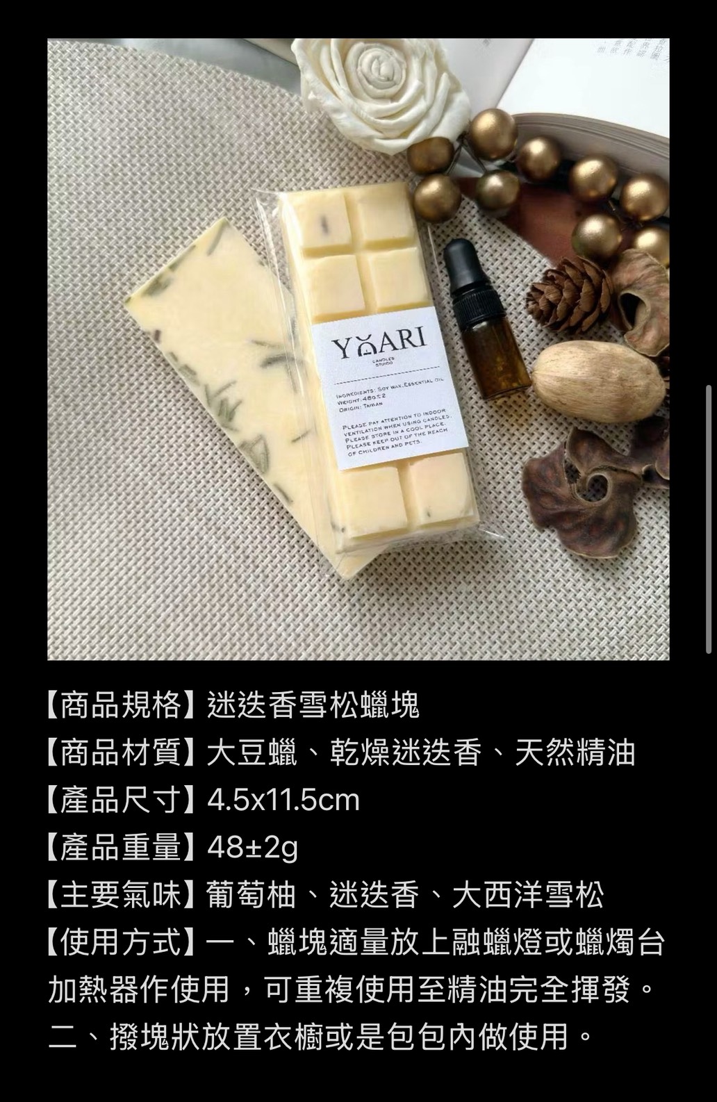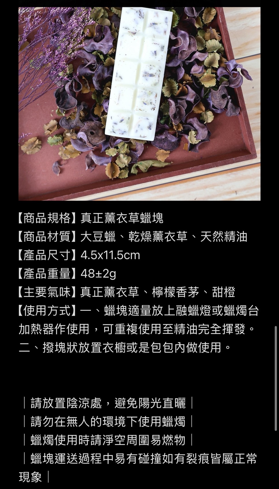 【使用方式】一、蠟塊適量放上融蠟燈或蠟燭台加熱器作使用,可重複使用至精油完全揮發。二、撥塊狀放置衣櫥或是包包內做使用。